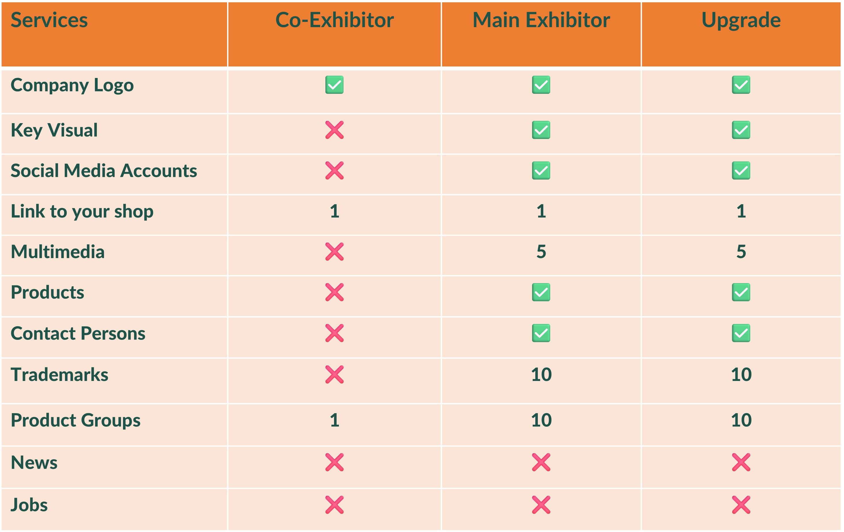 ten products. The media package is included in the stand booking. The Upgrade costs only 139, - €* if applicable, (*) Plus VAT and the following services are included: +Contact Persons with details+Link to your social media profiles+Entry in up to 10 categories for products groups+Presentation of up to 10 productsExhibitor Search