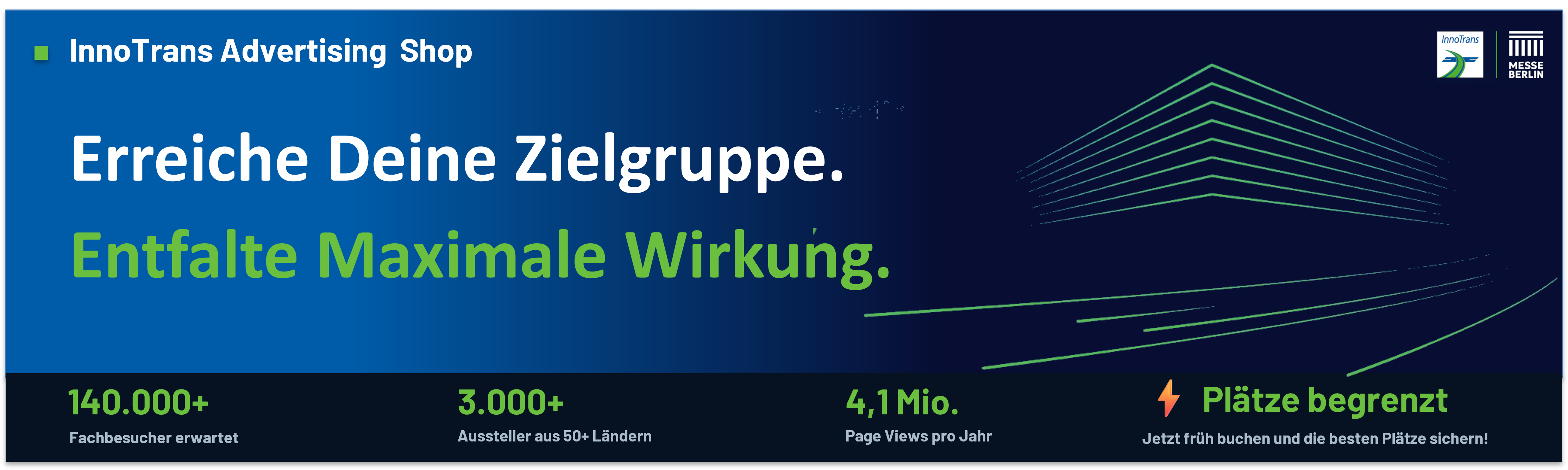 Online: -> Ausstellerverzeichnis -> InnoTrans Plus -> InnoTrans AppTop-Werbebanner auf InnoTrans.deTop-Werbebanner auf plus.InnoTrans.deTop- Werbebanner in der AppSandwich-Banner auf InnoTrans.de und in der AppStory in der InnoTrans AppMedia-Package Premium Upgrade inklusive - 10 Produkteinträge mit Bild Text und Multimedia - 2 Aussteller-News mit Bild,Text und Multimedia - 2 Stellenagebote*Für Aussteller in den Hallen 1-6** Für Aussteller in den anderen HallenLeistungszeitraum: Beginnend mit der Veröffentlichung und maximal bis zum Einspielung der Daten für die darauffolgende InnoTrans
