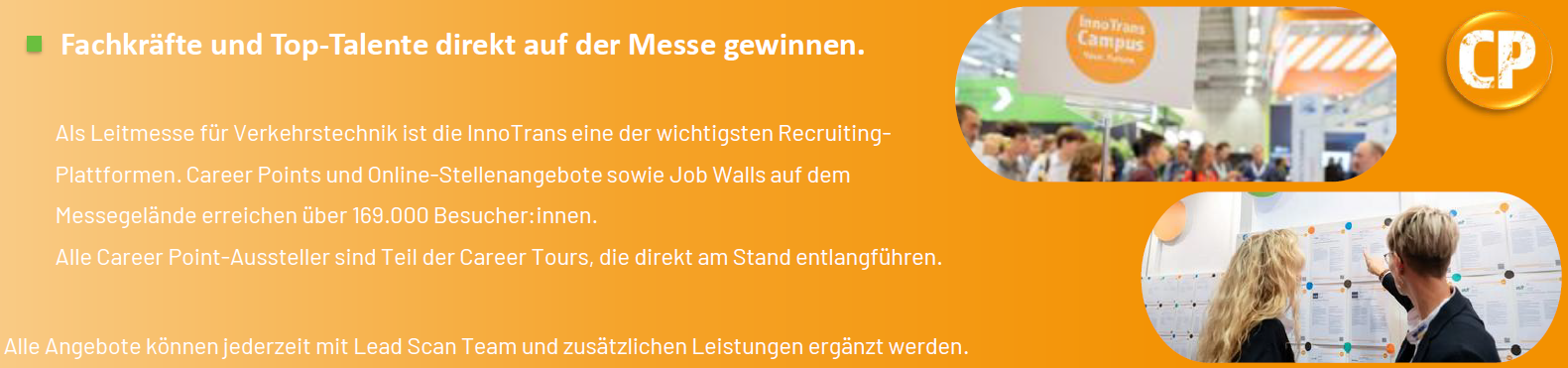 Die Standmarkierung mit dem Career Point Logo hilft Nachwuchskräften und Jobsuchenden, potenzielle Arbeitgeber auf den ersten Blick zu erkennen. Der Career Point ist für alle Aussteller buchbar und alle CP-Teilnehmer werden nach Verfügbarkeit für die Career Tours berücksichtigt.Die Bestellung des Career Points beinhaltet folgende Leistungen: Markierung mit dem Career Point Logo auf InnoTrans Plus, in der InnoTrans Plus App sowie in allen digitalen  Hallenplänen Ein Career Point Klebesticker zur Markierung Ihrer Standfläche auf der InnoTrans (Abholung im Aussteller-Service)Veröffentlichung eines Stellenangebots auf InnoTrans Plus - digital und live an der Jobwall im  RecruitingLAB Ihr Stand wird für die Career Tours als Stopp berücksichtigt (sprachlich und thematisch abgestimmt, nach Verfügbarkeit)InnoTrans Guide (print): Buchungen bis zum 16. Juli 2026 wurden im gedruckten Guide berücksichtigt  Haben Sie Fragen zu dem Angebot? Wir stehen Ihnen gerne zur Verfügung: innotrans@messe-berlin.de / T.: +49 303038 3131 Im Rahmen der Career Tours wird sich unser Kooperationspartner INPOLIS UCE GmBH zur Terminabsprache mit Ihnen in Verbindung setzen. INPOLIS UCE GmbH:Frau Jillian Blessing, careertours@inpolis.de / T.: +49 30 405 059 17