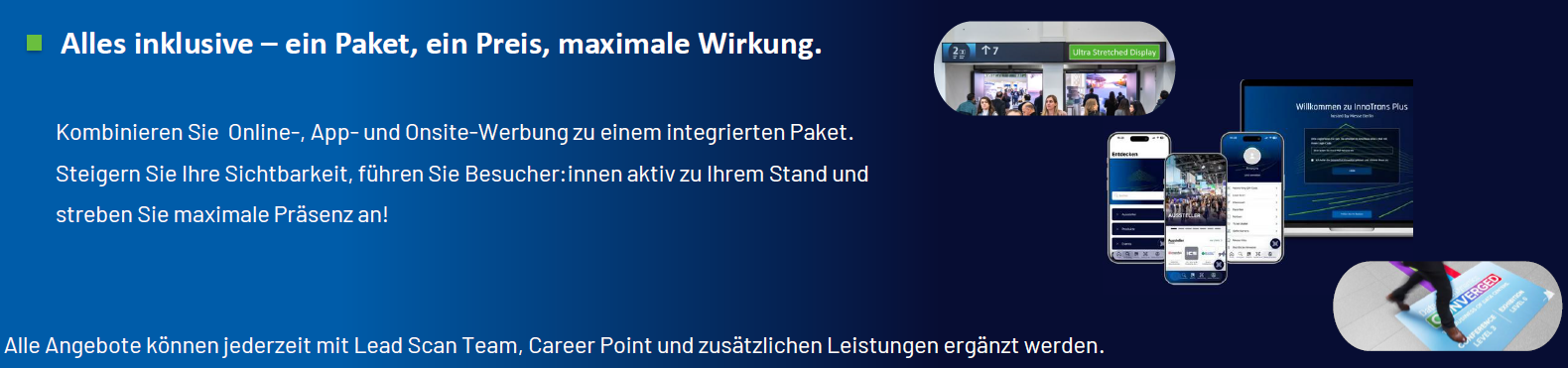 Ziehen die Besucher in Ihren Bann(er).Vor-Ort: -> InnoTrans Gelände1x Ultra Stretched Display GUIDING SYSTEM* oder 1x Mobile Digital Display GUIDING SYSTEM**1x Banner in Ihrer Hallenumgebung