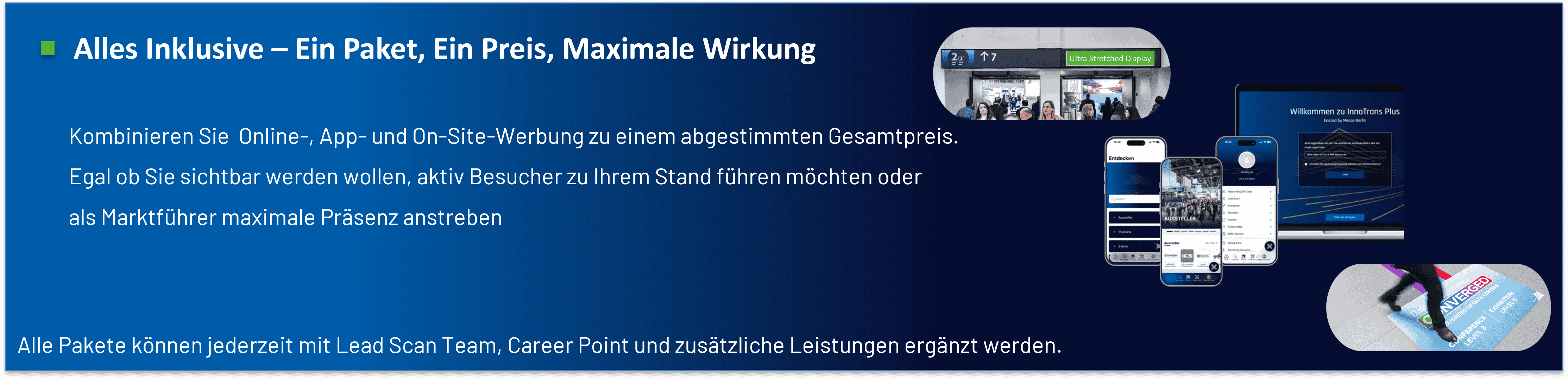Ziehen die Besucher in Ihren Bann(er).Vor-Ort: -> InnoTransgelände1x Ultra Stretched Display GUIDING SYSTEM* oder 1x Mobile Digital Display GUIDING SYSTEM**1x Banner in Ihrer Hallenumgebung