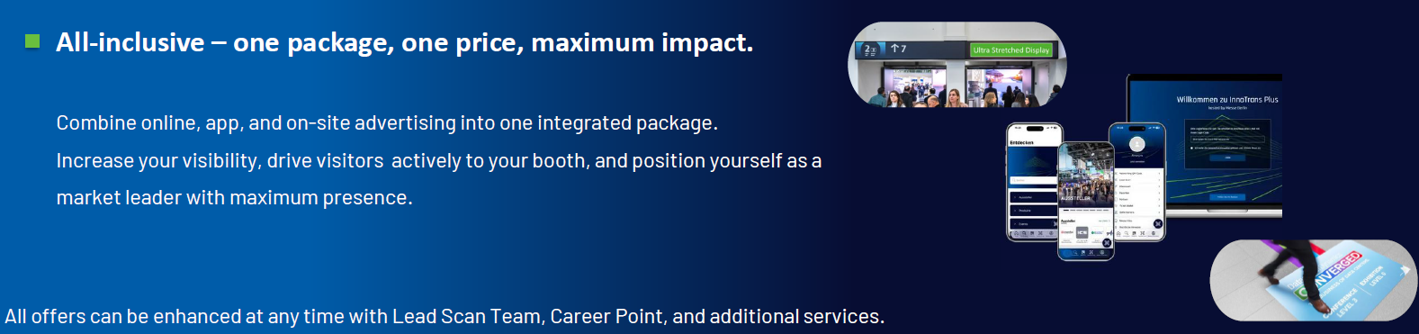 → ONLINE VISIBILITY:Gallery-Logo on InnoTrans.deGallery-Logo in InnTrans AppTop-5-Logo in online hall planThe perfect package booster: Premium Media Package Upgrade (€549) for significantly improved profile visibility on InnoTrans Plus.