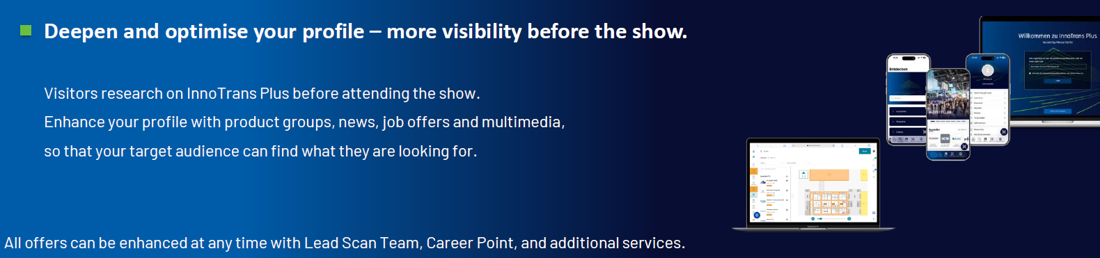 Upgrade your InnoTrans profile with the full range of digital visibility features — and stay visible year-round until the next edition