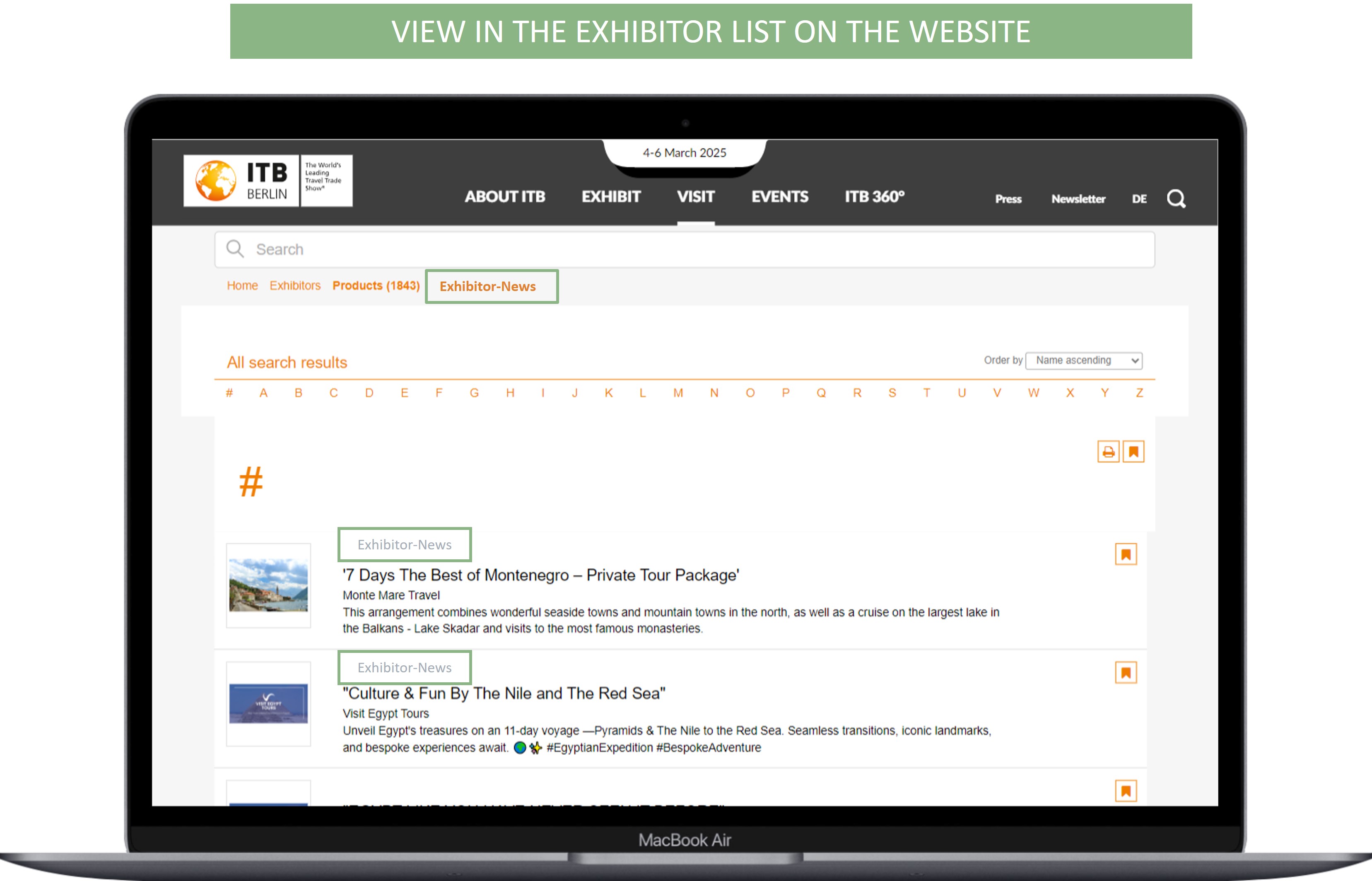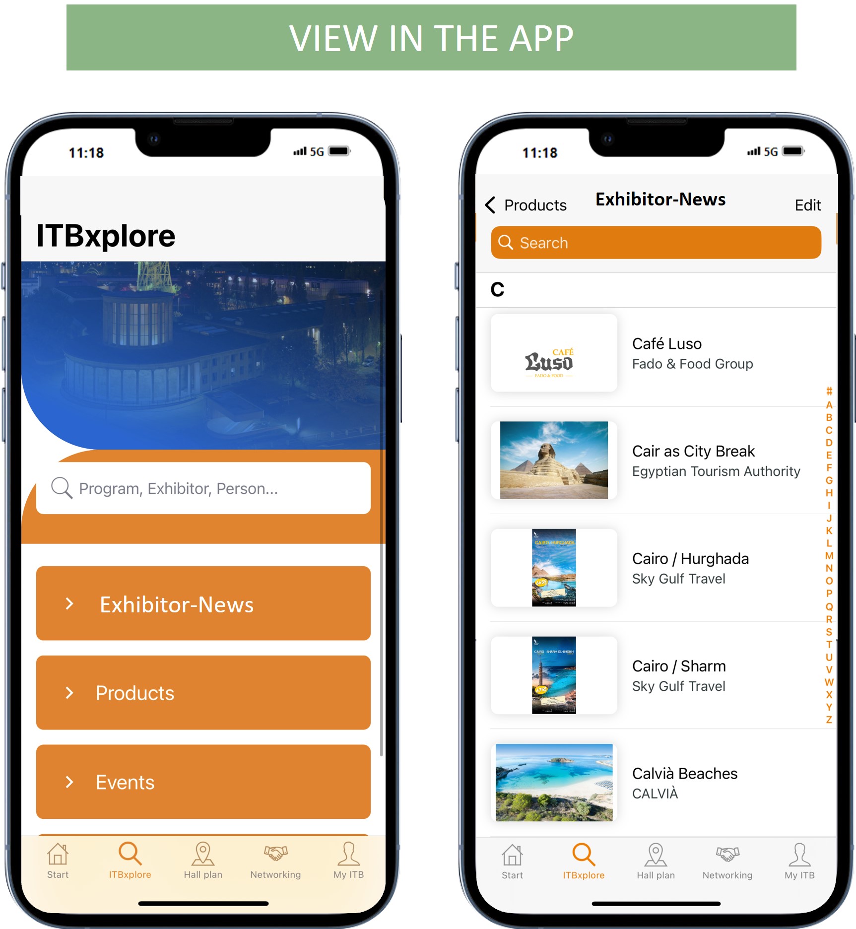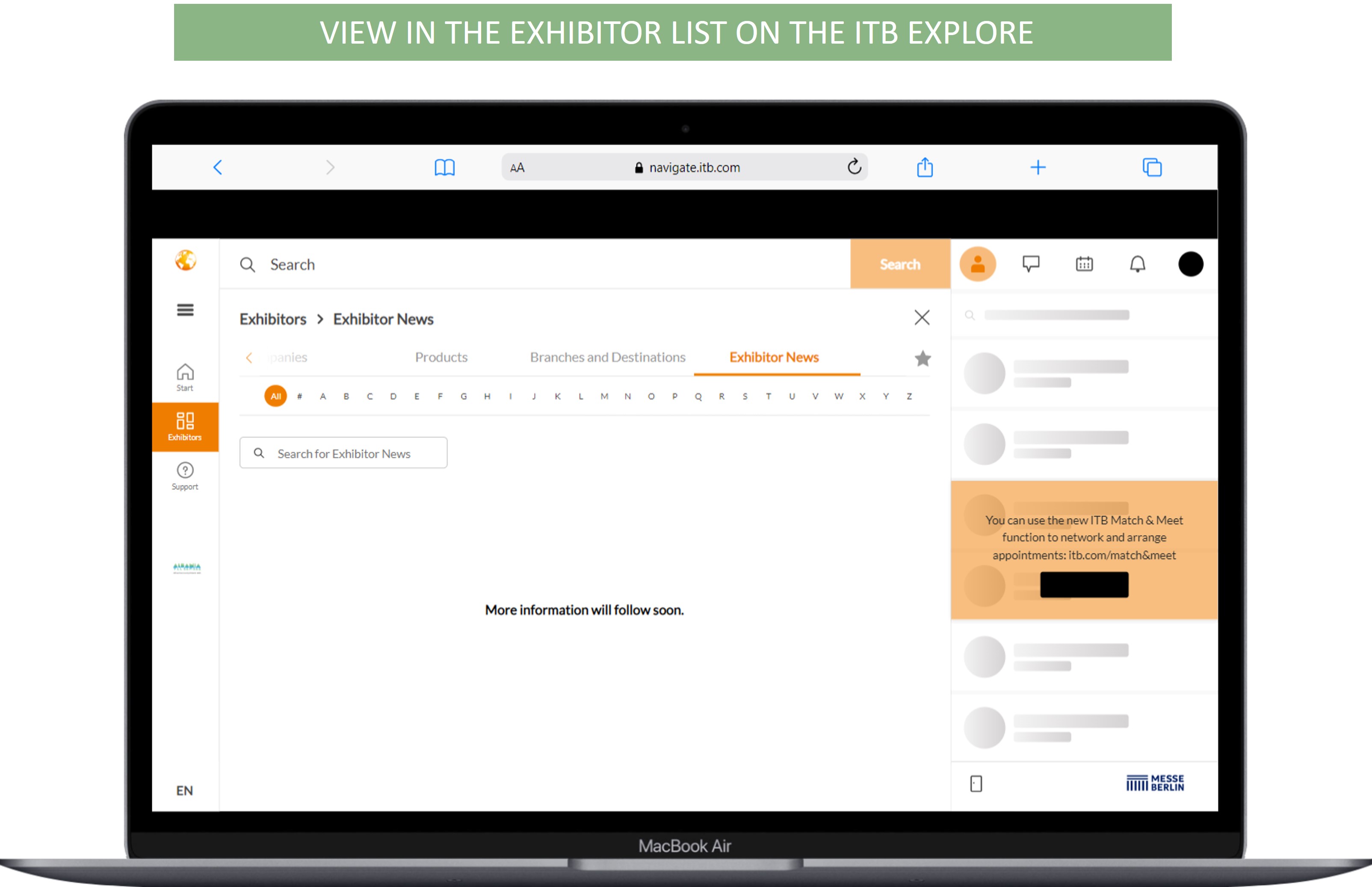 - Increased Visibility: Elevate your presence on the exhibitor list within the ITB App, ITB.com and ITB Navigator for a wider reach.