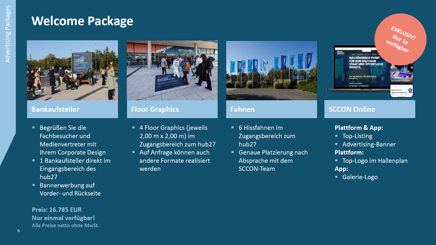Mit dem Welcome Package begrüßen Sie die Fachbesucher und Medienvertreter mit Ihrem Corporate Design direkt im Eingangsbereich der SCCON. Ihre Botschaft wird sofort beim Betreten der Veranstaltung sichtbar und setzt einen bleibenden Eindruck. Neben der prominenten Platzierung vor Ort, beinhaltet dieses Paket auch eine verstärkte digitale Präsenz, um Ihre Marke zu stärken und zu erweitern.